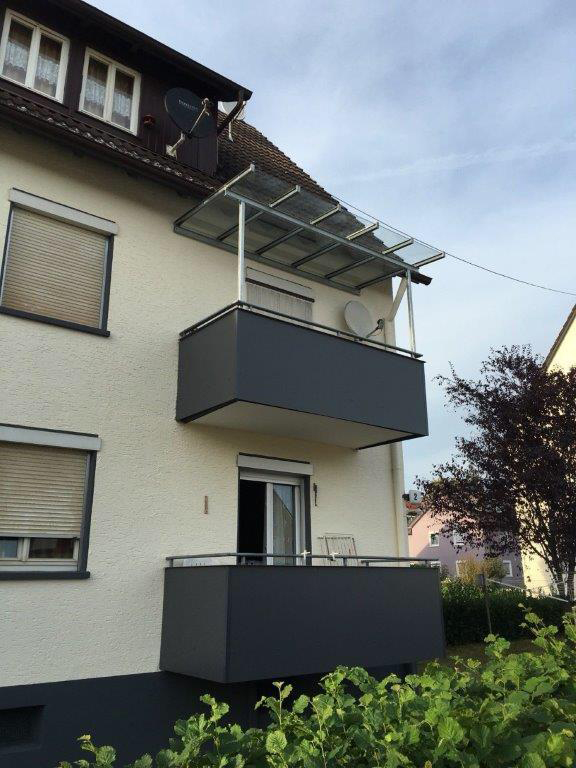 Wir liefern Ihnen die Überdachung inklusive 2 oder 4 Stützen (nach Wunsch). Bitte geben Sie die Höhe vom Balkonboden bis zum Befestigungspunkt am Haus, in cm an. Die beiden vorderen Stützen werden daraus mit einem Gefälle von ca. 10° berechnet.